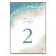 This elegant summer coastal destination wedding reception table number card features a hand painted watercolor beach scene in the corner with ocean waves lapping on the sea shore.