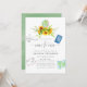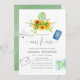 Trendy hand painted watercolor sunflower travel themed bridal shower invitation with sage green watercolor wash background.