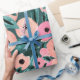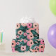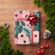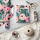 Pink and teal floral patterned wrapping paper with accents of peach.