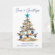 Modern Minimalist Elegance Calligraphy Ink Pen Handwritten Script Seas & Greetings Coastal Folded Holiday Card includes a Watercolor Christmas Tree make of beach ocean driftwood, seashells, sand dollars, nautical anchor ornament and topped with a starfish. Navy Blue Text.