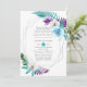 Colourful watercolor tropical leaves and orchids wedding invitation with silver geometric frame and turquoise blue watercolor wash reverse.