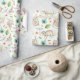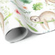 Wrapping paper design has watercolor illustrated pattern that features napping sloths with an assortment of tropical foliage.