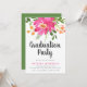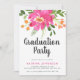 A bright, colourful and modern graduation party invitation featuring a large bold spray bouquet of watercolor flowers in tropical pink, orange and green. The phrase "graduation party" is in modern brush lettered style black font, guest of honour in fuchsia pink, and event details in black in the lower third of the invitation. The back of the invitation is in solid green.