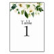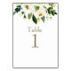 Table Number. Watercolor White Floral & Foliage. Gold Text.