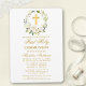 Elegant Watercolor Floral Wreath First Holy Communion Invitation includes white roses, flowers and greenery. Gold Cross.