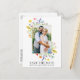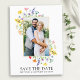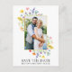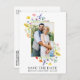 Modern Watercolor Wildflower Wedding Wedding Engagement Announcement Save The Date Postcard includes delicate yellow, pink, peach, dusty blue, sage green, purple, red and orange wild flowers, poppies, eucalyptus leaves and other beautiful botanical greenery on a gold frame. Couple Photo.