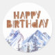 Unique watercolor painted mountain, pine trees & wooden -happy birthday- lettered Birthday sticker
