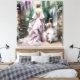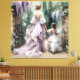 Watercolor of a beautiful mother and young girl walking through a garden gate with wisteria flowers and white dove