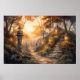 Watercolor painting of a long stone monument-lined path through the woods. The setting sun sets the fall colours afire with golden light. An ancient stone staircase ascends from beside the path up a hill alongside it. Lanterns line the staircase to light the way for travelers at night.