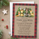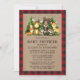 Watercolor Woodland Animals Baby Shower Invitation. Baby Animals include Bear, Deer, Moose, Raccoon, Bunny Rabbit, Fox and Owl with a backdrop of pine trees. Kraft Paper Style, Forest Green Pine, Red Buffalo Plaid.
