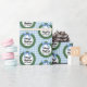 This classic Christmas wrapping paper features a watercolor wreath with blue bow and says "Merry Christmas" and personalized with your family name.
