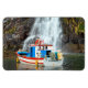 A fishing boat pictured against the backdrop of a waterfall; Quintupeu Fjord, Northern Patagonia, Chile - a beautiful corner of South America where the Andes plunge into the Pacific Ocean. [Our travel photography and designs are available as gifts for the home, cards, jigsaw puzzles, wall art and more]