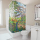 Vintage Art Nouveau Tiffany Stained Glass Window Art Home Decor Shower Curtain features a beautiful forest landscape in springtime of winding Waterfall, blossoming Iris flowers & Cherry Trees, Birch and a Lotus Pond. Exquisite art with an oriental sense of good feng-shui.