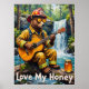This charming artwork features a bear dressed as a firefighter, complete with a helmet and sunglasses, playing an acoustic guitar while seated on a fallen log beside a beautiful waterfall. A jar of honey sits nearby. The background shows lush greenery and the cascading water flowing into a clear stream. The painting uses thick, textured brushstrokes, giving a whimsical and heartwarming feel, with "Love My Honey" written below.