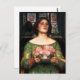 John William Waterhouse Gather Ye Rosebuds While Ye May postcard. Oil painting on canvas from 1909. Based on the Robert Herrick poem, Gather Ye Rosebuds is one of English painter John Waterhouse’s finest literary works. The painting features a beautiful girl in a green dress with gold lace and floral embroidery. The young woman holds a pewter bowl of freshly cut pink, red, and white roses in her hands. Her dark red hair is fastened with pearls, and a mirror stationed behind her reveals a stained glass window featuring a coat of arms and purple tulips. A great gift for fans of J.W. Waterhouse, Romantic English art, literary painting, and the Pre-Raphaelites.