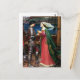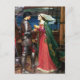 John William Waterhouse Tristan and Isolde postcard. Oil painting on canvas from 1916. English painter John Waterhouse regularly drew on literary themes. Tristan and Isolde is one of his last paintings and reveals the artist utilizing bright colours and hard outlines. The Irish princess Isolde stands on the deck of a ship holding a potion in a flowing red dress with fur trim. The girl also wears a green shawl with gold embroidery as her veil blows in the wind. The hero Tristan stands in full armour as he takes the golden chalice from the girl. Both characters stand on a ship at sea, and a small castle can be seen in the background. A great gift for fans of J.W Waterhouse, the Pre-Raphaelites, English Romantic painting, and Northern myth.