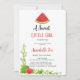 This cute "a sweet little girl is on her way" girl's baby shower invitation features a white background with watermelons and green leaves in watercolor. The reverse side features a white background with watermelon and pink stripe patterns.