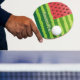 Red and green watermelon flag with stripes and seeds. Custom text.