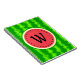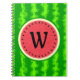 This pretty watermelon monogram notebook design has a round fruit that looks like it's been sliced, so the juicy pink-red flesh of the melon shows, along with a circle of black watermelon seeds. The berry also has a speckled green, mottled rind.