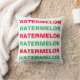Watermelon Throw Pillow designed by Nisha Prabhu CuteHomeGifts. This design features red and green typography text ''WATERMELON'' on front side and red green stripes pattern on back side. Summer fruit tropical watermelon pillow.