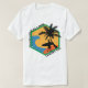 Check out this amazing casual graphic t-shirt that features bold black typography and an abstract paint illustration of a retro vintage sunset on a palm beach with a surfer riding the waves.