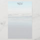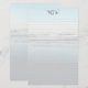 Monogrammed and lined personal writing paper. A light beach scene background has waves rolling in to the beach at low tide. Light lines cover the paper on the front with a template for three initial monogram at the top. The back of the paper also has the beach scene.