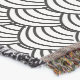 This throw blanket has an Art Deco design of black curved lines in a triangle shape on a field of white repeated across the design.