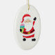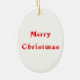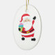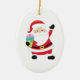 This oval ceramic ornament features a jollySanta holding a wrapped gift in one hand and waving the other merrily. the text on the back reads Merry Christmas.