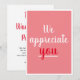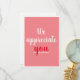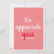 A casual "We appreciate you" card. Red and white script on pink appreciation card that you can make personal with a nice gesture from the company boss, co-workers or anyone. Just use the "personalize this template" feature to edit the text to make it your own. Other paper styles available.