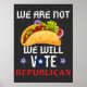 We Are Not Tacos We Will Vote Republican design is perfect for republicans who want and deserve a competent, responsive, much better president that is currently absent from the country. Great for Hispanic Americans who want a better future for family & friends in Texas, Florida, California & the whole United States. It can be also given as a birthday, Mother's Day, Father's Day, Thanksgiving, Halloween, or Christmas gift to give to a wife, husband, mom, dad, sister, boyfriend, girlfriend, or brother who also wants much better leadership that is currently absent from the country.