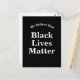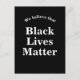 A postcard that says “We believe that Black Lives Matter” on a black background. Send it out to let others know, announce events, or organize for change.