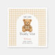 A rustic themed baby shower "We Can Bearly Wait" featuring cute preppy bear wearing luxury designer plaid outfit in brown, beige colours and gingham background. You can easily personalize this with your details.