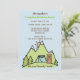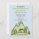 Super cute camp out birthday party design features a graphic of a tent with party bunting hanging on it. The tent is in front of mountains and within the trees. Standing next to the camping tent is a cute little brown bear. There is customizable text in brown and green font where you can add the birthday boy's name and all of the birthday camping party information. Below the tent and bear graphic is text in brown font that says "We can "bearly" wait!" The background of the invitation is a pale blue colour. The reverse side of the invitation has the same blue background and is covered in a pattern of the camping tent graphic. This is an adorable camping birthday theme invitation. Matching paper plates, napkins and postage also available. Also available for girls in pink!