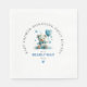 This cute baby shower napkin design features an adorable watercolor teddy bear with balloons in a heart shape and personalizable blue and black typography "we can bearly wait" with customizable typography.