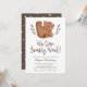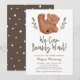Cute bear theme baby shower featuring hand painted illustration of a cub with greenery leaves. The text says "we can bearly wait!" This invitation is great for a gender neutral shower in the fall.