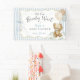 Personalize this adorable neutral light dusty blue, beige, and white "We Can Bearly Wait!" teddy bear theme baby boy shower 3x5 ft. vinyl banner featuring a sweet watercolor teddy bear holding checkerboard pattern balloons and a hand drawn beige bow frame over blue ticking pinstripes. It's the cutest way to showcase baby's shower theme - add under a balloon arch or to a photo backdrop! Easily add your wording to make it uniquely yours. Find the matching invitation, diaper raffle & books for baby card, decor, games, signs & more in the full collection above ♥ Custom design requests and template questions are always welcome - click the "message" button or email direct (with a quick response time!): contact@figandlilyco.com. Design is lovingly created by Fig and Lily Studios - sending blessings and thanks for being here with us ♥