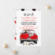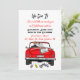 Vintage convertible car with bride and groom and just married sign with cans hanging off the back of their car driving away after party invitation.