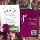 This beautiful wedding invitation is romantic, playful, and stylish. It features a fun title with a cute heart and modern script lettering reading "we do" at the top, with all the details below. At the bottom is a gorgeous single long-stemmed magenta plum, cassis purple, or berry coloured rose lying on its side reflecting or mirrored in a pool of water. The back is a marbled magenta purple colour with a bouquet of roses tied with a white satin bow. There is a heading reading "the details" with room for a short note and a customizable QR Code to direct your guests to a website with more information and/or to RSVP online. Classy, elegant and sophisticated, this invitation is the perfect way to invite your friends and family to share in your joy on your special day!