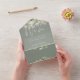 All-in-one wedding invitation featuring pretty string lights, floral greenery and elegant typography on a sage green background. The invitation includes a perforated RSVP card featuring a QR code. Designed by Thisisnotme©