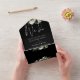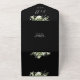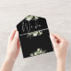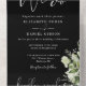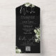 All-in-one wedding invitation featuring floral greenery and elegant typography on a black background. The invitation includes a perforated RSVP card featuring a QR code. Designed by Thisisnotme©