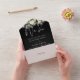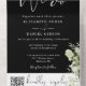 All-in-one black and white wedding invitation featuring pretty string lights, floral greenery and elegant typography. The invitation includes a perforated RSVP card with your wedding website QR code and details. Designed by Thisisnotme©