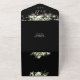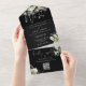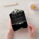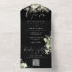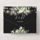 All-in-one wedding invitation featuring pretty string lights, floral greenery and elegant typography on a black background. The invitation includes a perforated RSVP card featuring a QR code. Designed by Thisisnotme©