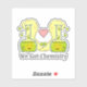 Two cute happy chemistry flasks with green fluid bubbling out the top facing each other with happy smiling faces and a pink love heart between them. Below are the words we got chemistry in grey lettering.