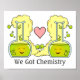 Two cute happy chemistry flasks with green fluid bubbling out the top facing each other with happy smiling faces and a pink love heart between them. Below are the words we got chemistry in grey lettering.