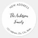 We have moved, return address sticker. Personalize and add your family name, your new address. Curved text. White background, black text.