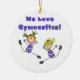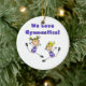 Two blonde haired stick figure girl gymnasts in purple leotards and purple text that reads "We Love Gymnastics!" on girl gymnast Tshirts, mugs, bags, cards, stickers, keychains, and more.