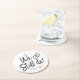 A fun and unique script lettered paper coaster tailored specifically to your anniversary party. It features the words "We still do" with wedding rings resting about it. Underneath this are the names of the bride and groom and the wedding date.