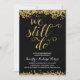 A golden 50th wedding anniversary party invite that features the romantic phrase "We still do" written in beautiful calligraphy script with a faux gold foil look, faux gold confetti on the top and bottom of the card, and a chic black background.