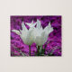 A small puzzle of 2 white tulips on a fushia flowered background.