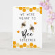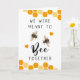 Cute anniversary pun card featuring hand illustrated bees with honeycomb and hearts. The funny text says "we were meant to bee together."